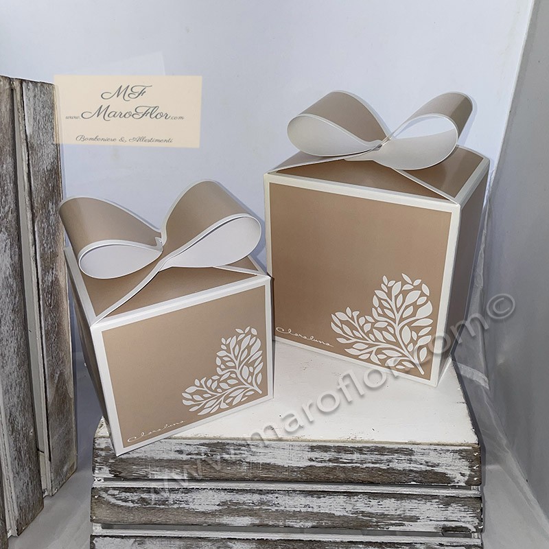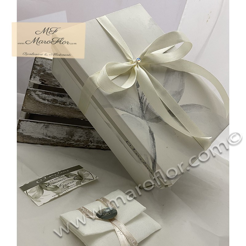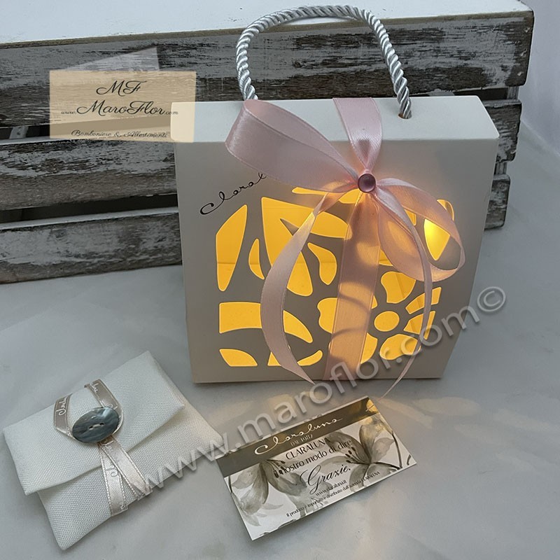 Claraluna vi assicura una bella Bomboniera completa di Astuccio fondo e coperchio marchiato, flex moderna ed elegante,